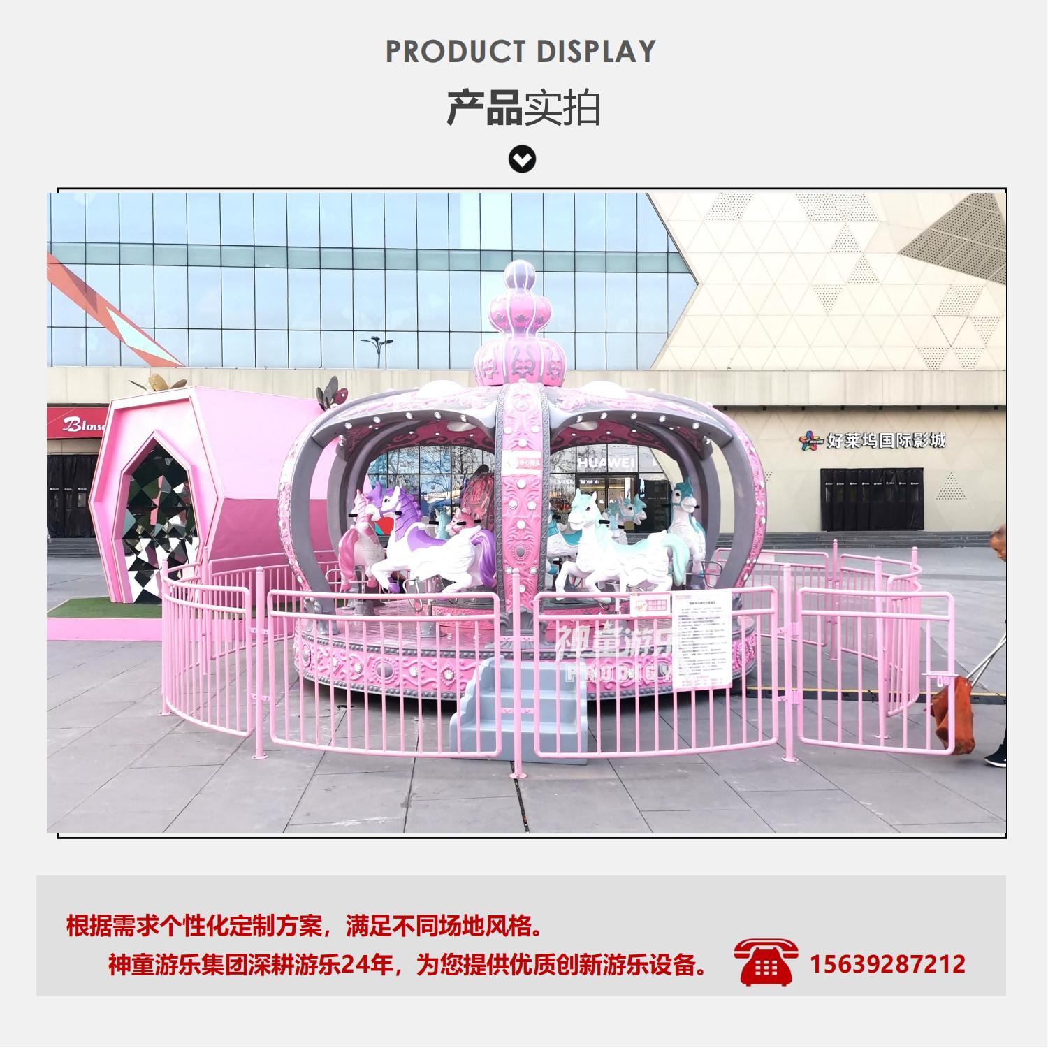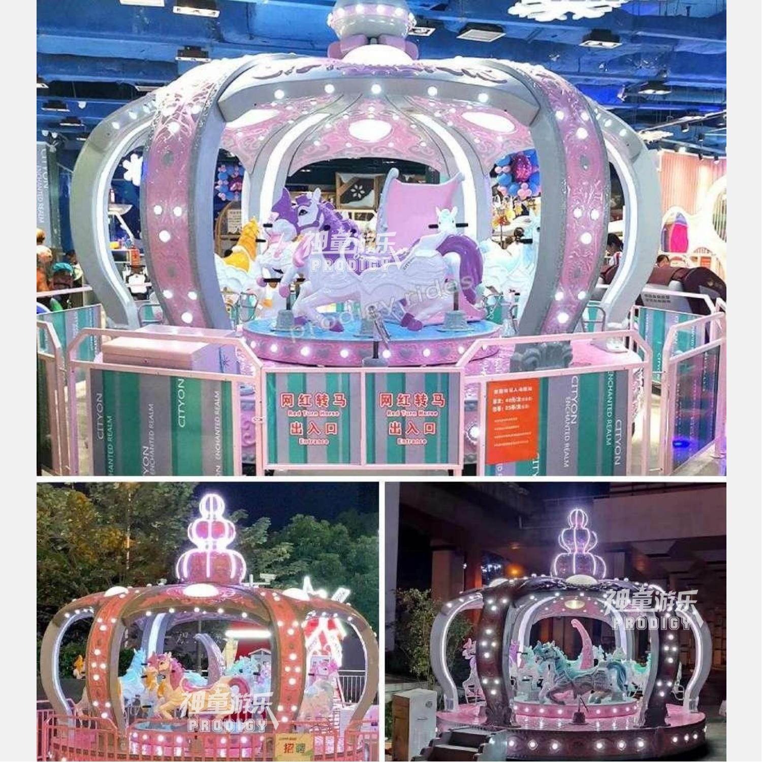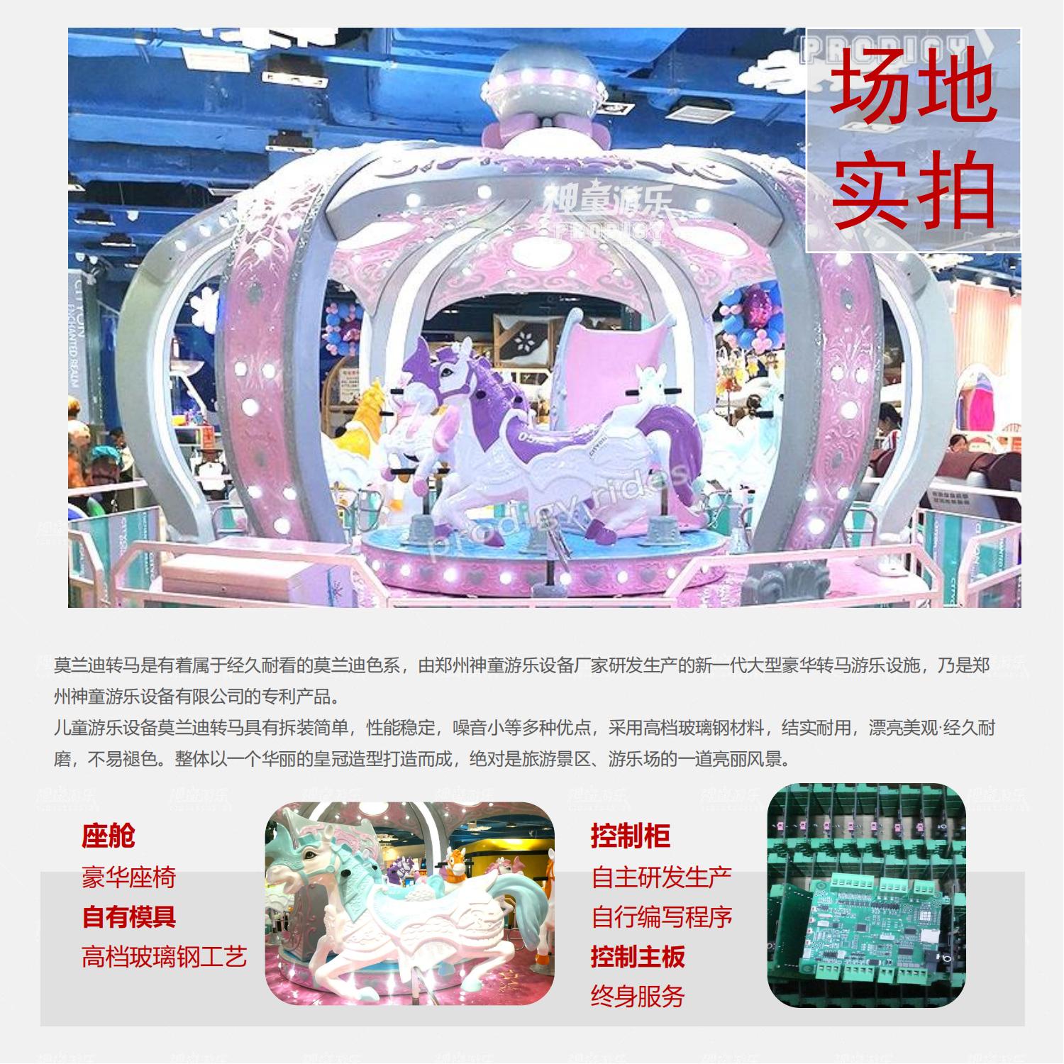 兒童游樂設(shè)備莫蘭迪轉(zhuǎn)馬具有拆裝簡(jiǎn)單,性能穩(wěn)定,噪音小等多種優(yōu)點(diǎn),采用高檔玻璃鋼材料,結(jié)實(shí)耐用,漂亮美觀·經(jīng)久耐磨,不易褪色。整體以一個(gè)華麗的皇冠造型打造而成,絕對(duì)是旅游景區(qū)、游樂場(chǎng)的一道亮麗風(fēng)景。