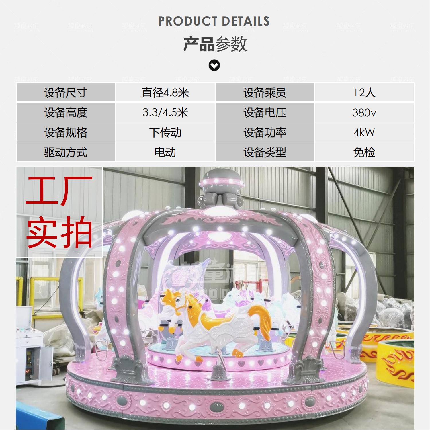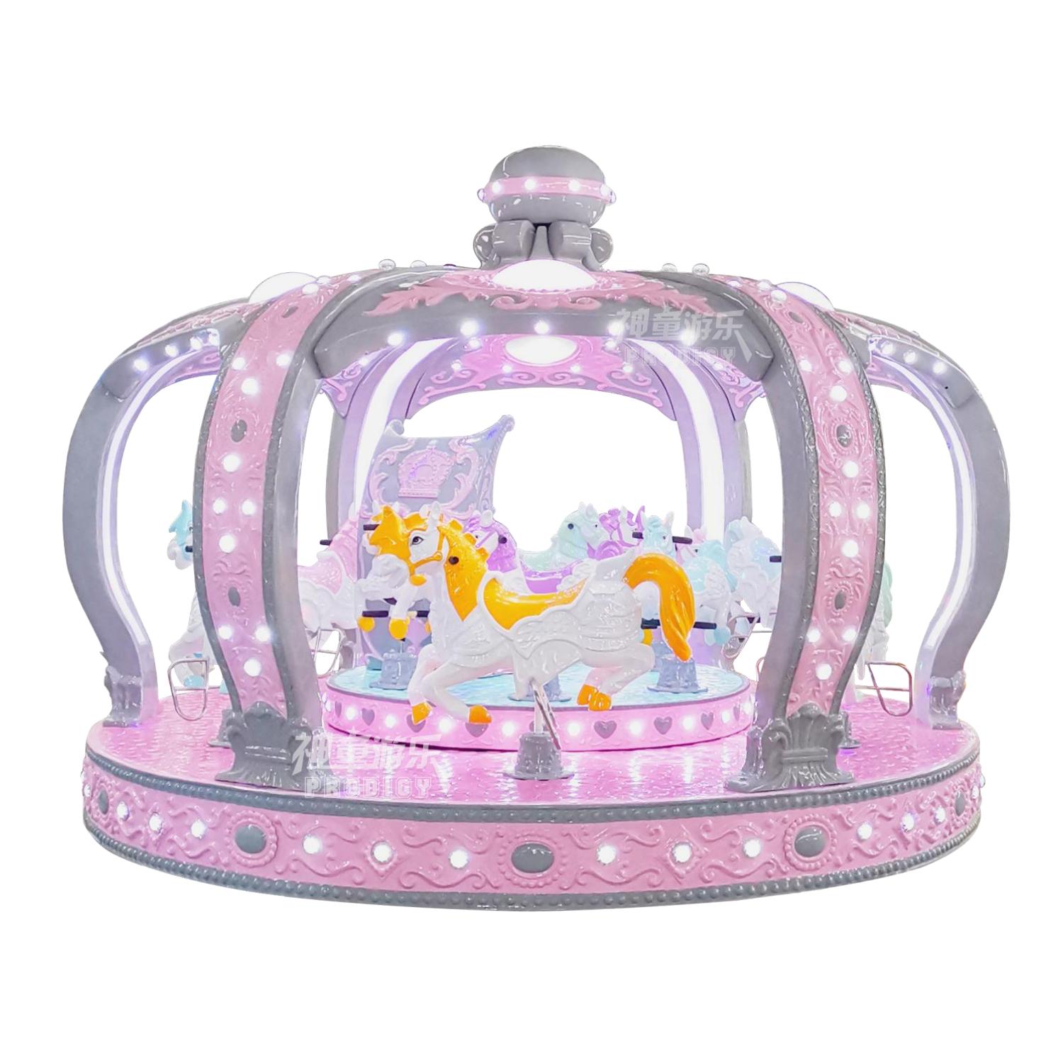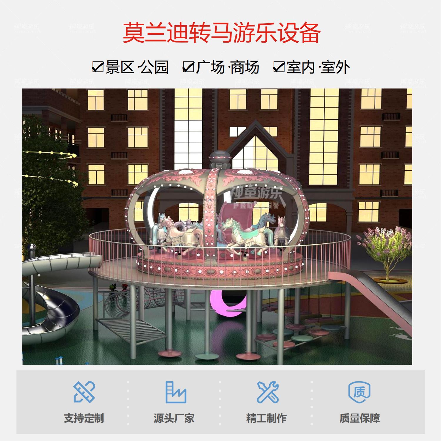 兒童游樂設(shè)備莫蘭迪轉(zhuǎn)馬具有拆裝簡(jiǎn)單,性能穩(wěn)定,噪音小等多種優(yōu)點(diǎn),采用高檔玻璃鋼材料,結(jié)實(shí)耐用,漂亮美觀·經(jīng)久耐磨,不易褪色。整體以一個(gè)華麗的皇冠造型打造而成,絕對(duì)是旅游景區(qū)、游樂場(chǎng)的一道亮麗風(fēng)景。