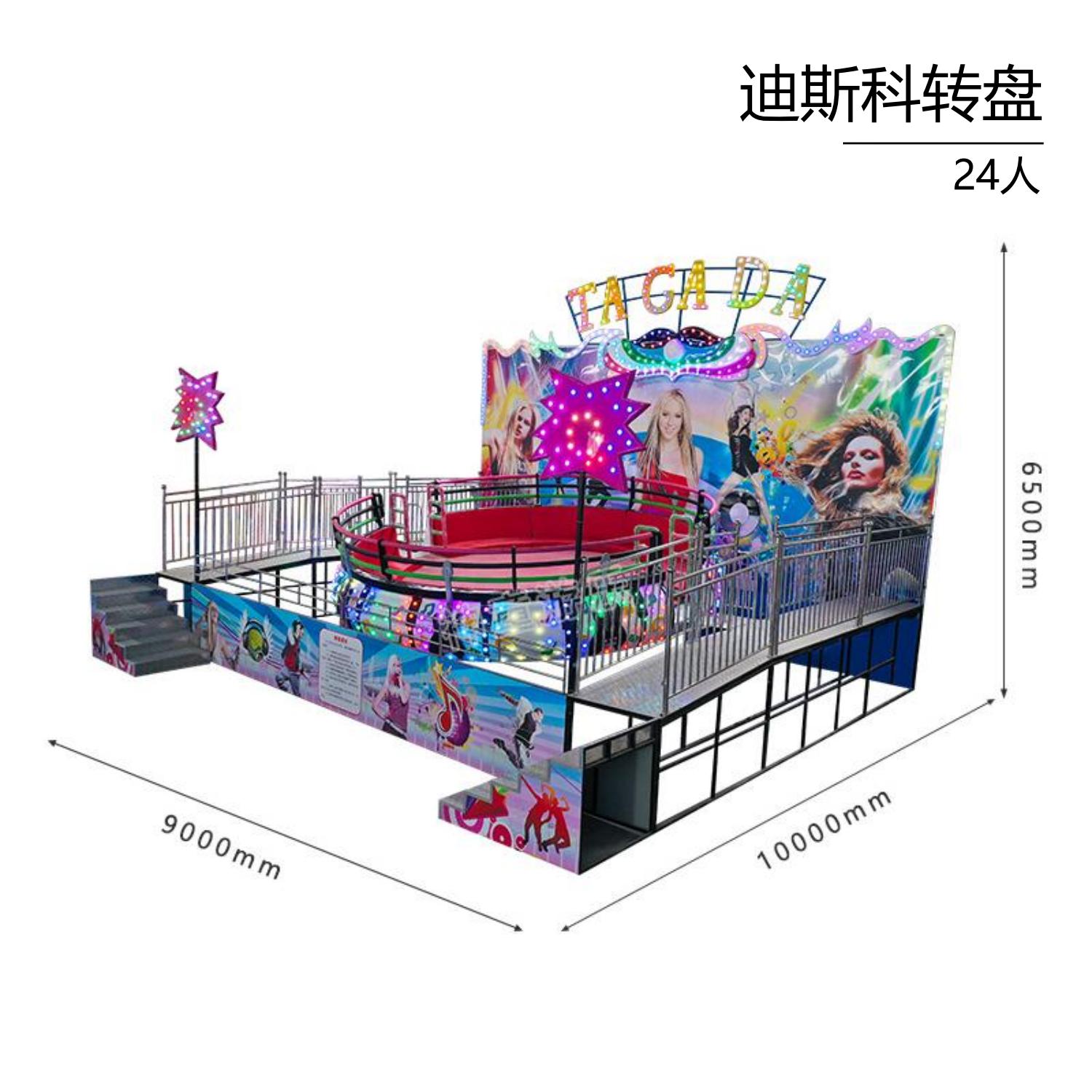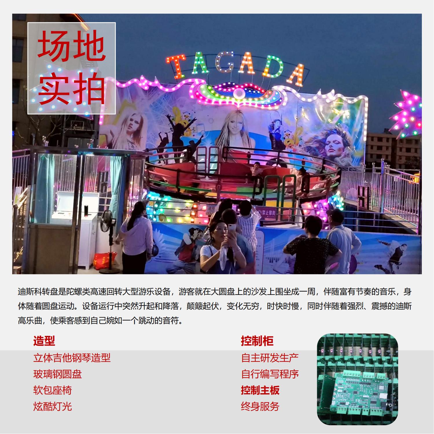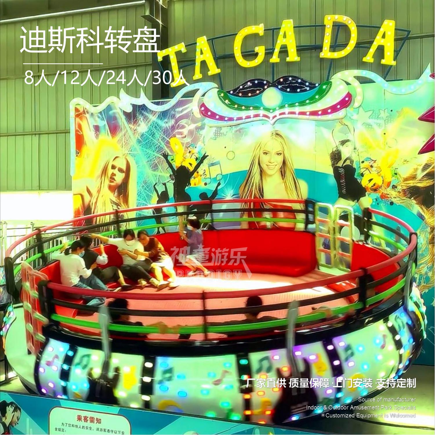迪斯科轉(zhuǎn)盤是陀螺類高速回轉(zhuǎn)大型游樂設(shè)備,游客就在大圓盤上的沙發(fā)上圍坐成一周,伴隨富有節(jié)奏的音樂,身體隨著圓盤運(yùn)動。設(shè)備運(yùn)行中突然升起和降落,顛筋起伏,變化無窮,時快時慢,同時伴隨著強(qiáng)烈、震撼的迪斯高樂曲,使乘客感到自己婉如一個跳動的音符。