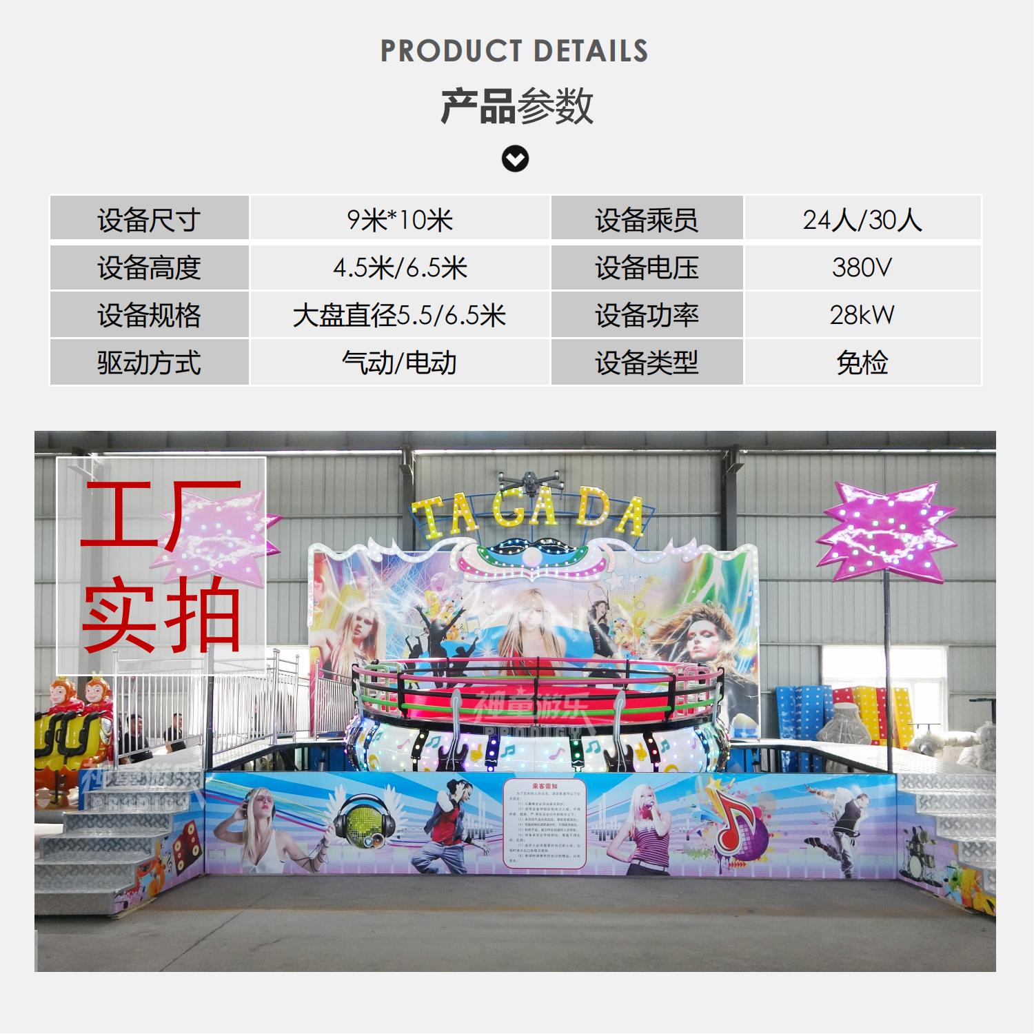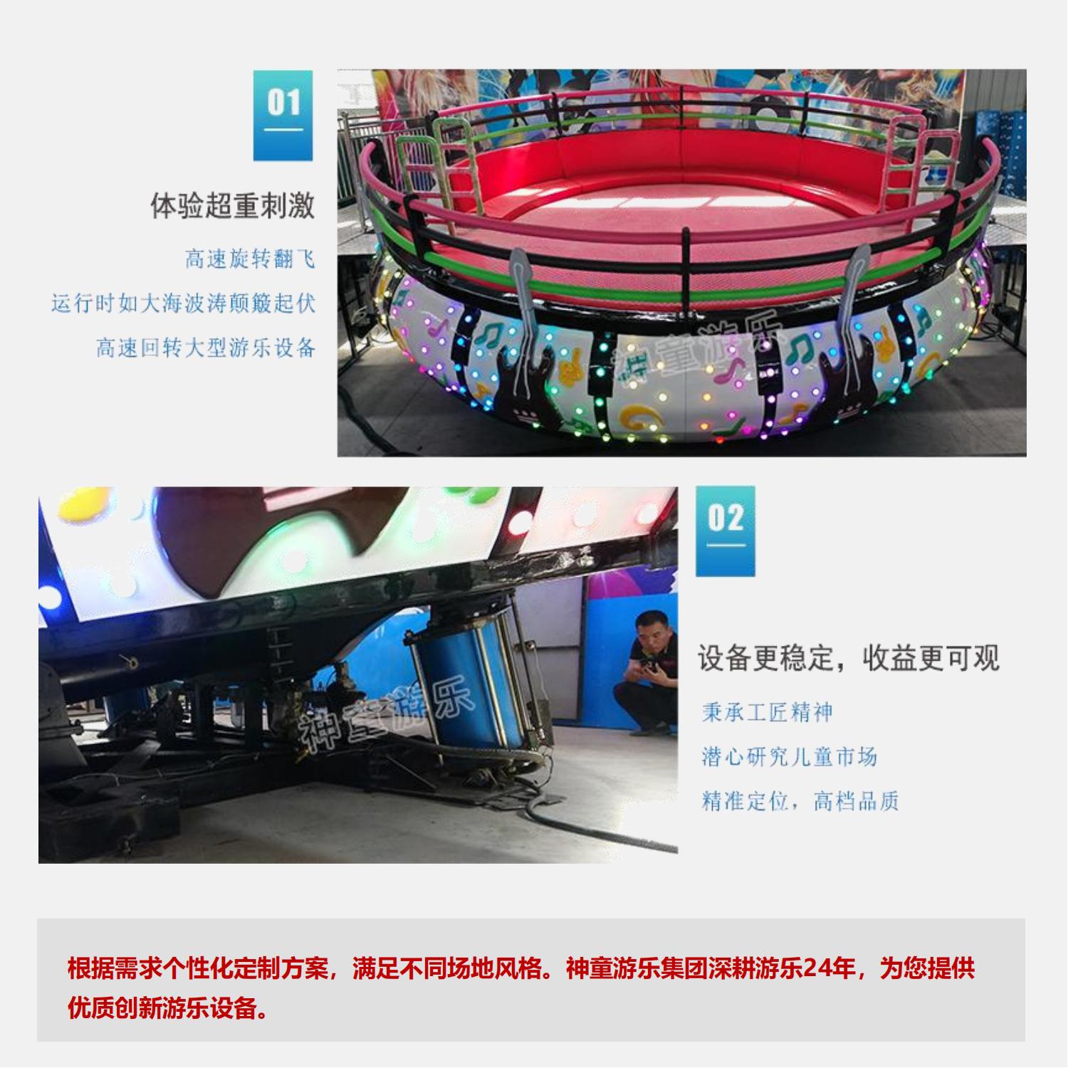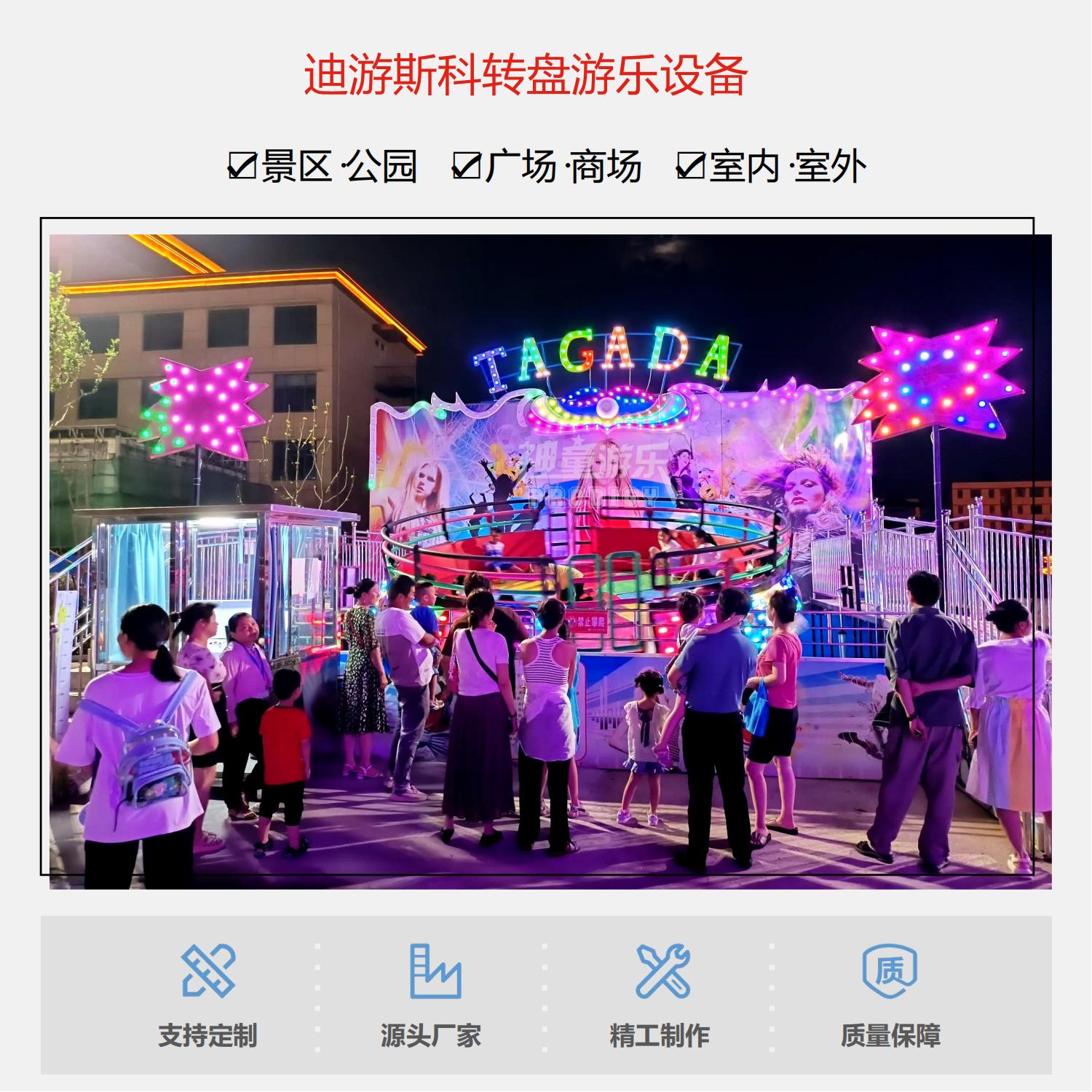 迪斯科轉(zhuǎn)盤是陀螺類高速回轉(zhuǎn)大型游樂設(shè)備,游客就在大圓盤上的沙發(fā)上圍坐成一周,伴隨富有節(jié)奏的音樂,身體隨著圓盤運(yùn)動。設(shè)備運(yùn)行中突然升起和降落,顛筋起伏,變化無窮,時快時慢,同時伴隨著強(qiáng)烈、震撼的迪斯高樂曲,使乘客感到自己婉如一個跳動的音符。