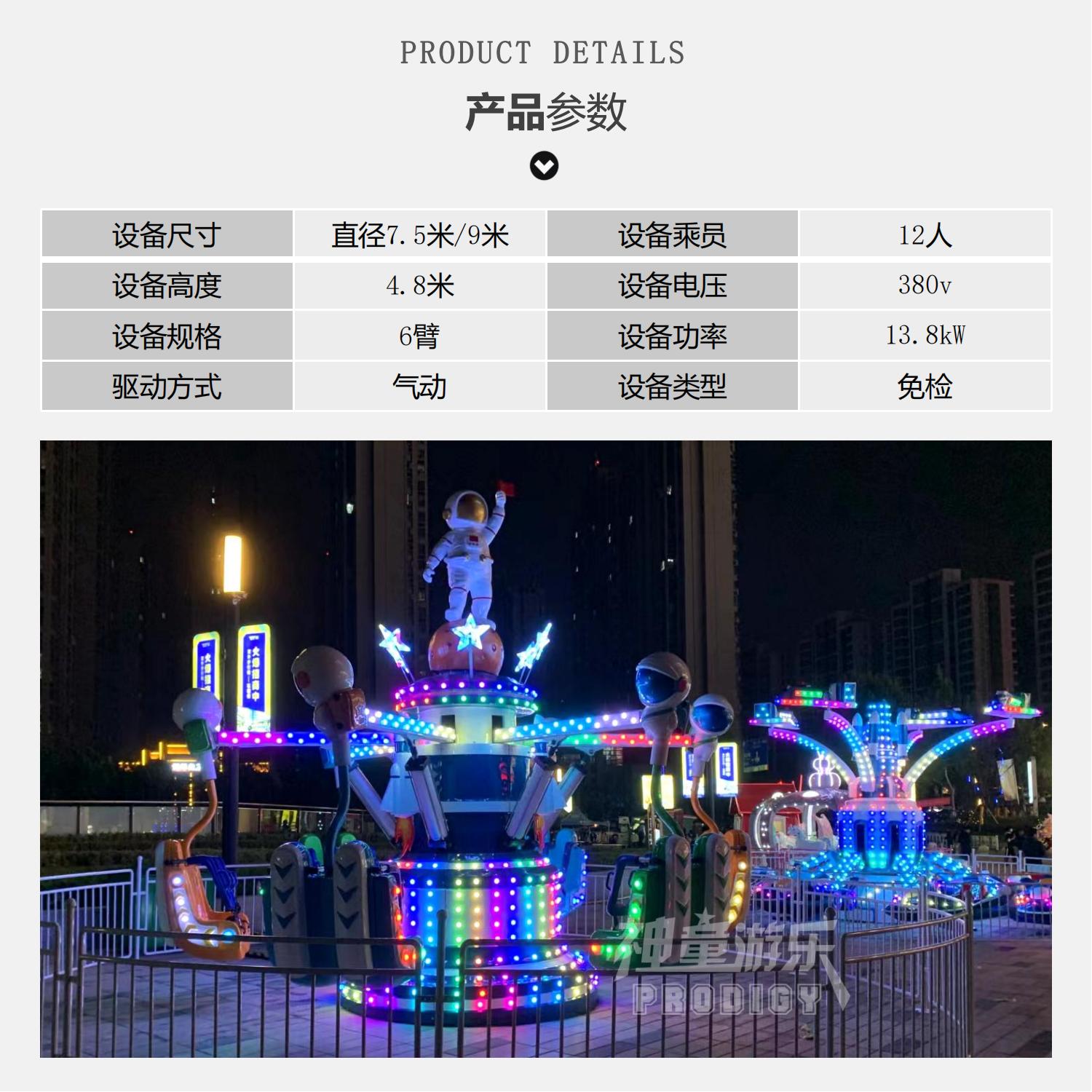 航天夢是由機(jī)械、氣動和電氣系統(tǒng)組成,是一種繞垂直軸中心旋轉(zhuǎn)、升降自由的升降飛機(jī)類游樂設(shè)備。 雙人親子座艙,游客在飛行跟隨大盤旋轉(zhuǎn),座艙會有節(jié)奏的彈跳升降和自轉(zhuǎn),會有失重感,安全且刺激,令人流連忘返。 航天夢不但性能優(yōu)異,操作簡單,太空主題非常新穎、華麗迷人的彩燈裝飾,逼真刺激的空戰(zhàn)音響效果,深受大人兒童喜愛。