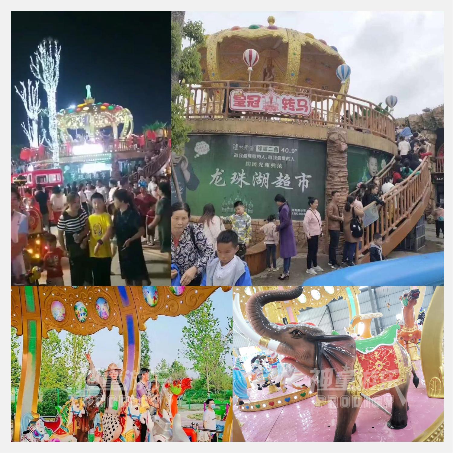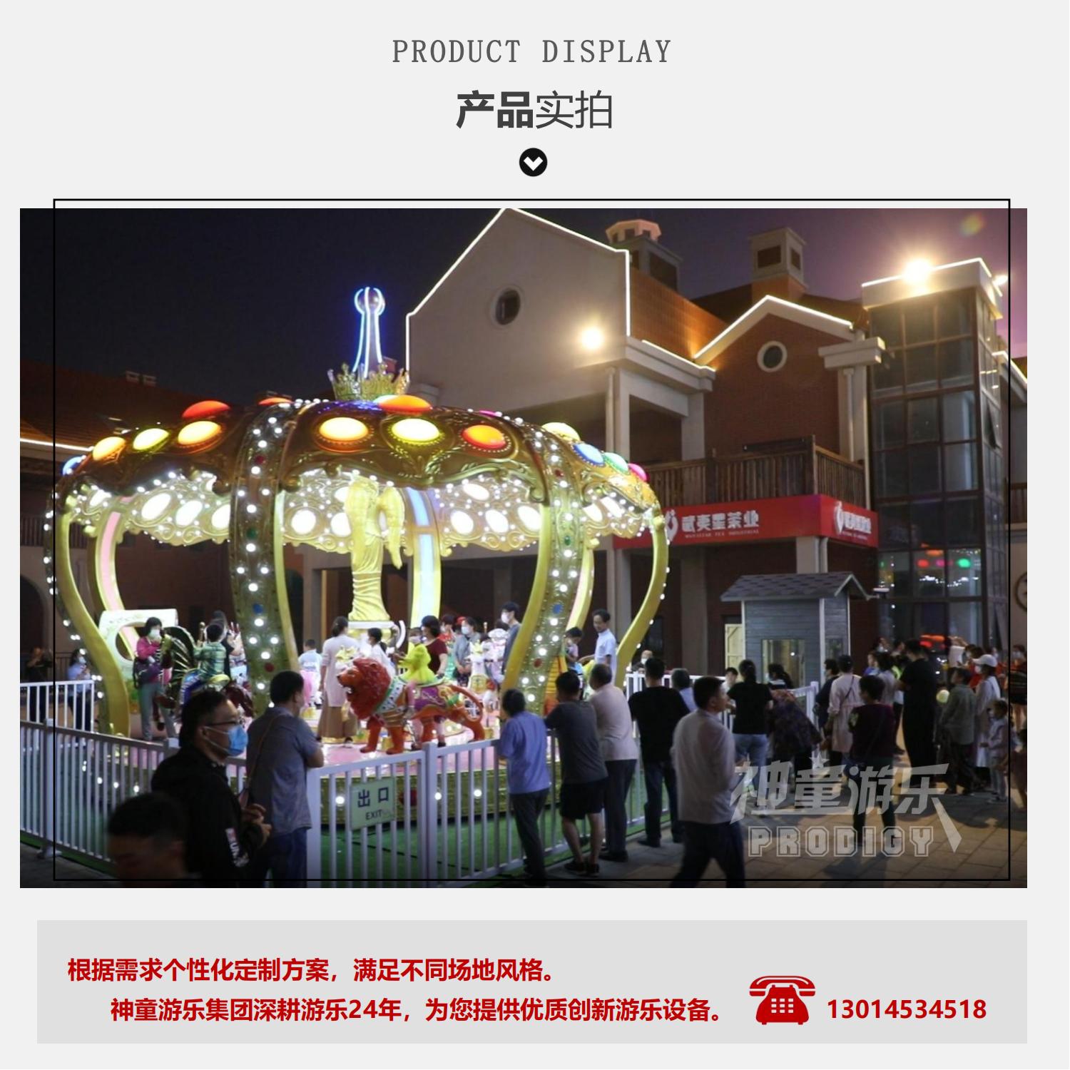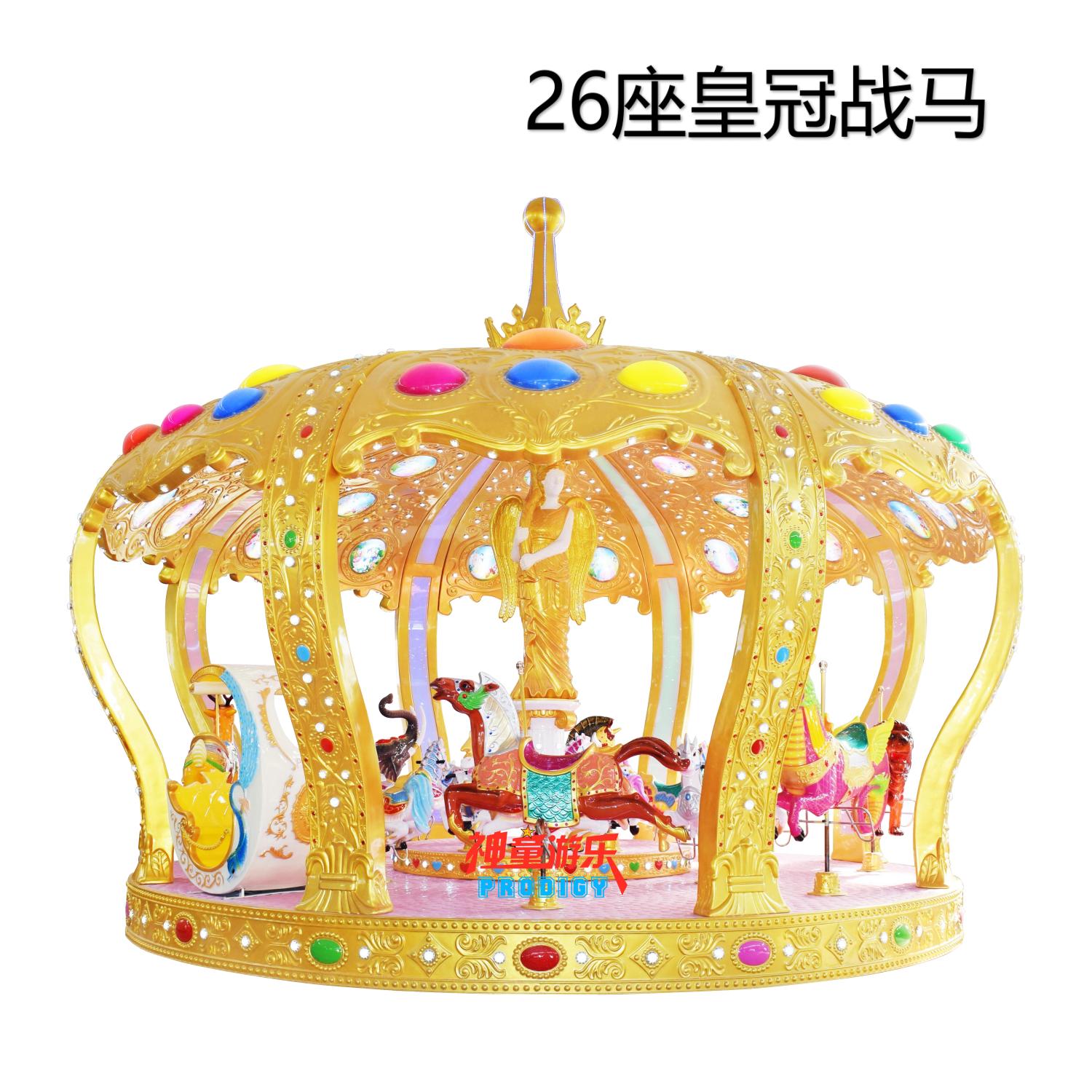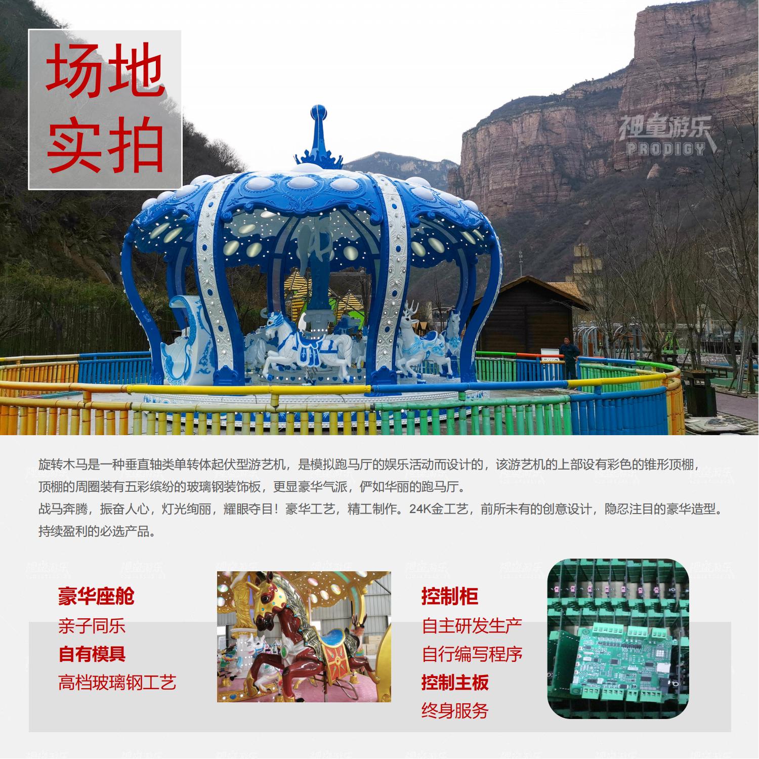 旋轉(zhuǎn)木馬是一種垂直軸類單轉(zhuǎn)體起伏型游藝機(jī),是模擬跑馬廳的娛樂活動而設(shè)計(jì)的,該游藝機(jī)的上部設(shè)有彩色的錐形頂棚,頂棚的周圈裝有五彩繽紛的玻璃鋼裝飾板,更顯豪華氣派,儼如華麗的跑馬廳。戰(zhàn)馬奔騰,振奮人心,燈光絢麗,耀眼奪目!豪華工藝,精工制作。24K金工藝,前所未有的創(chuàng)意設(shè)計(jì),隱忍注目的豪華造型。持續(xù)盈利的必選產(chǎn)品。