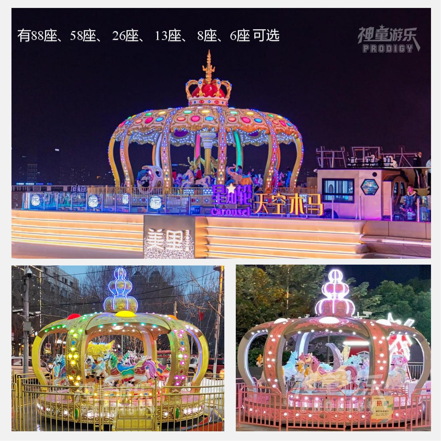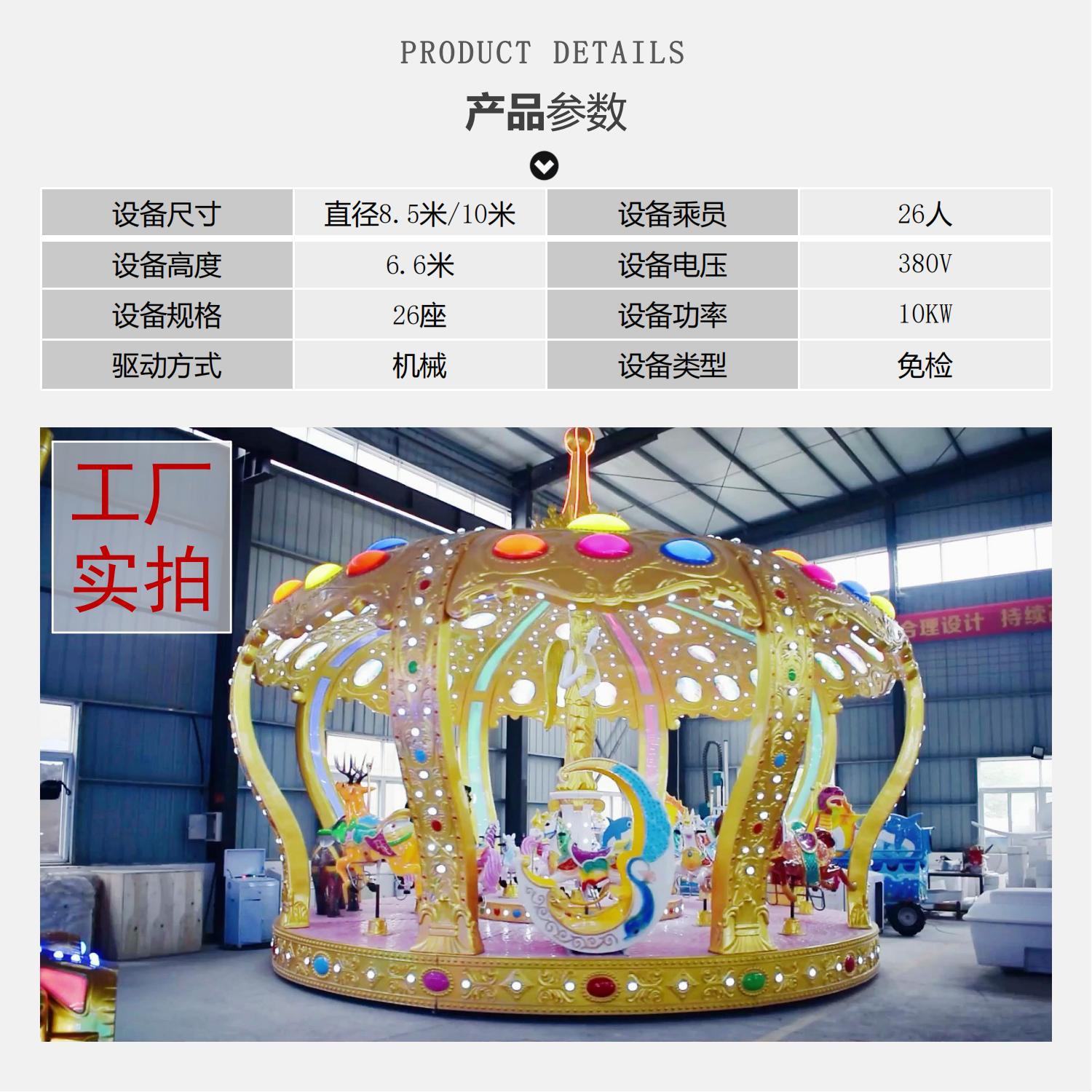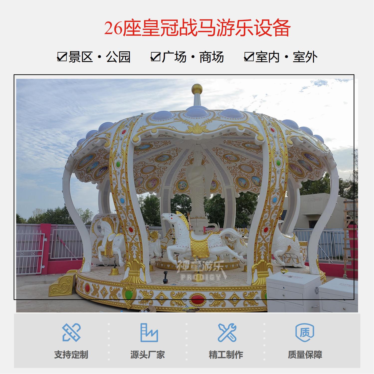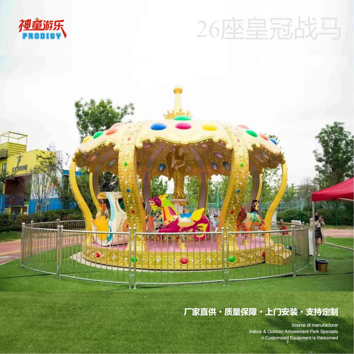 旋轉(zhuǎn)木馬是一種垂直軸類單轉(zhuǎn)體起伏型游藝機(jī),是模擬跑馬廳的娛樂活動而設(shè)計(jì)的,該游藝機(jī)的上部設(shè)有彩色的錐形頂棚,頂棚的周圈裝有五彩繽紛的玻璃鋼裝飾板,更顯豪華氣派,儼如華麗的跑馬廳。戰(zhàn)馬奔騰,振奮人心,燈光絢麗,耀眼奪目!豪華工藝,精工制作。24K金工藝,前所未有的創(chuàng)意設(shè)計(jì),隱忍注目的豪華造型。持續(xù)盈利的必選產(chǎn)品。