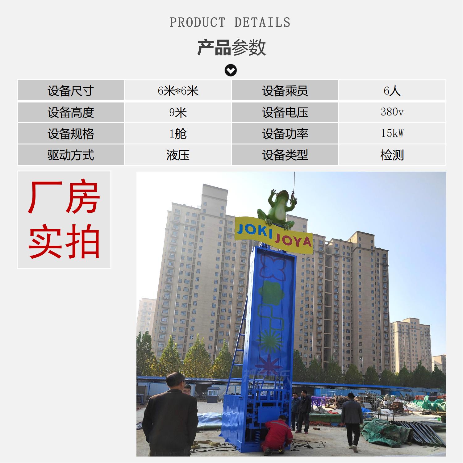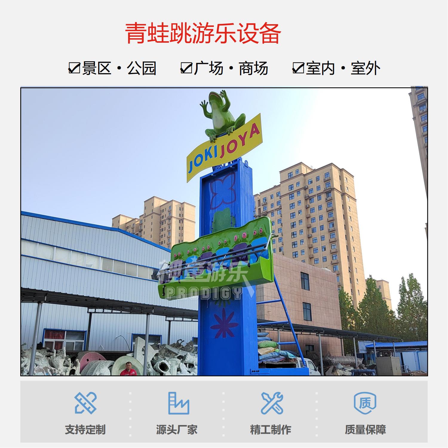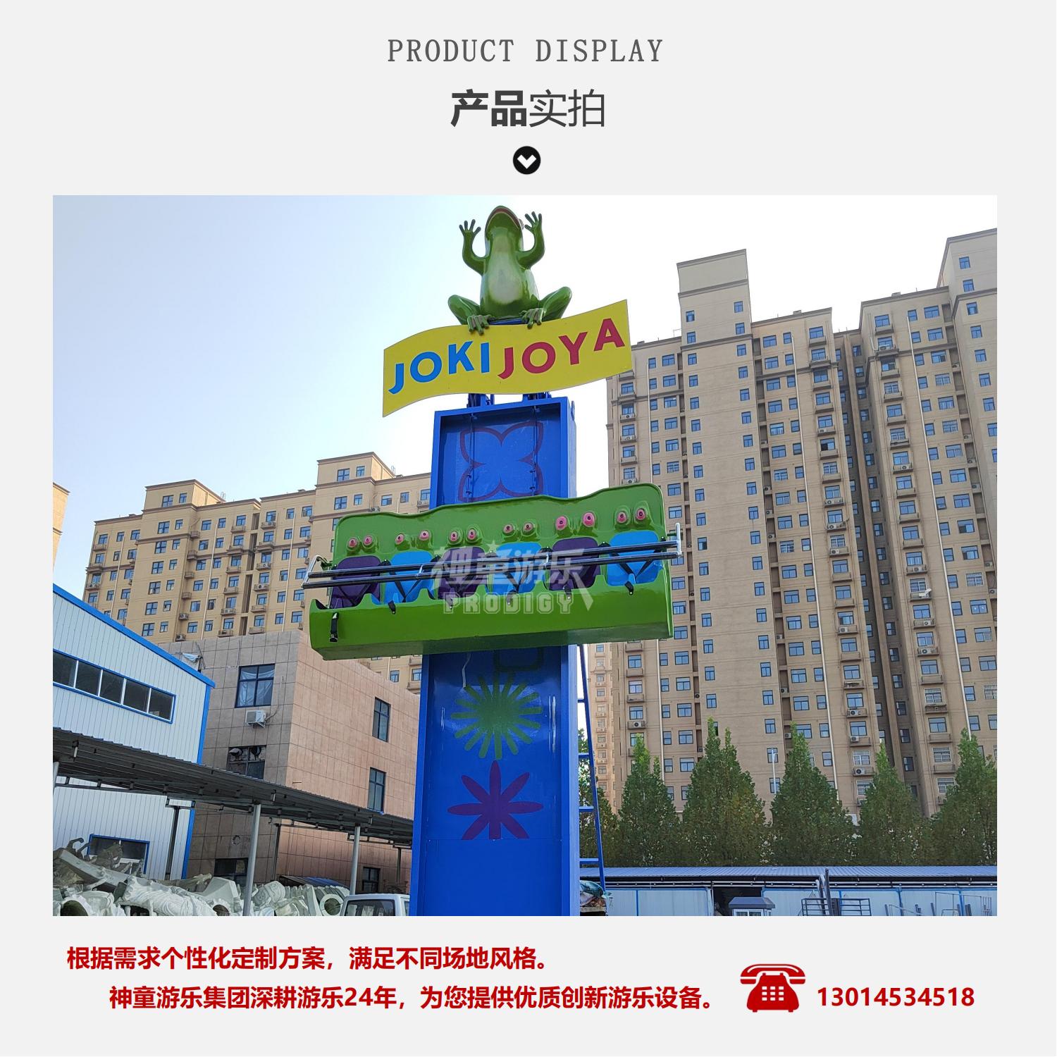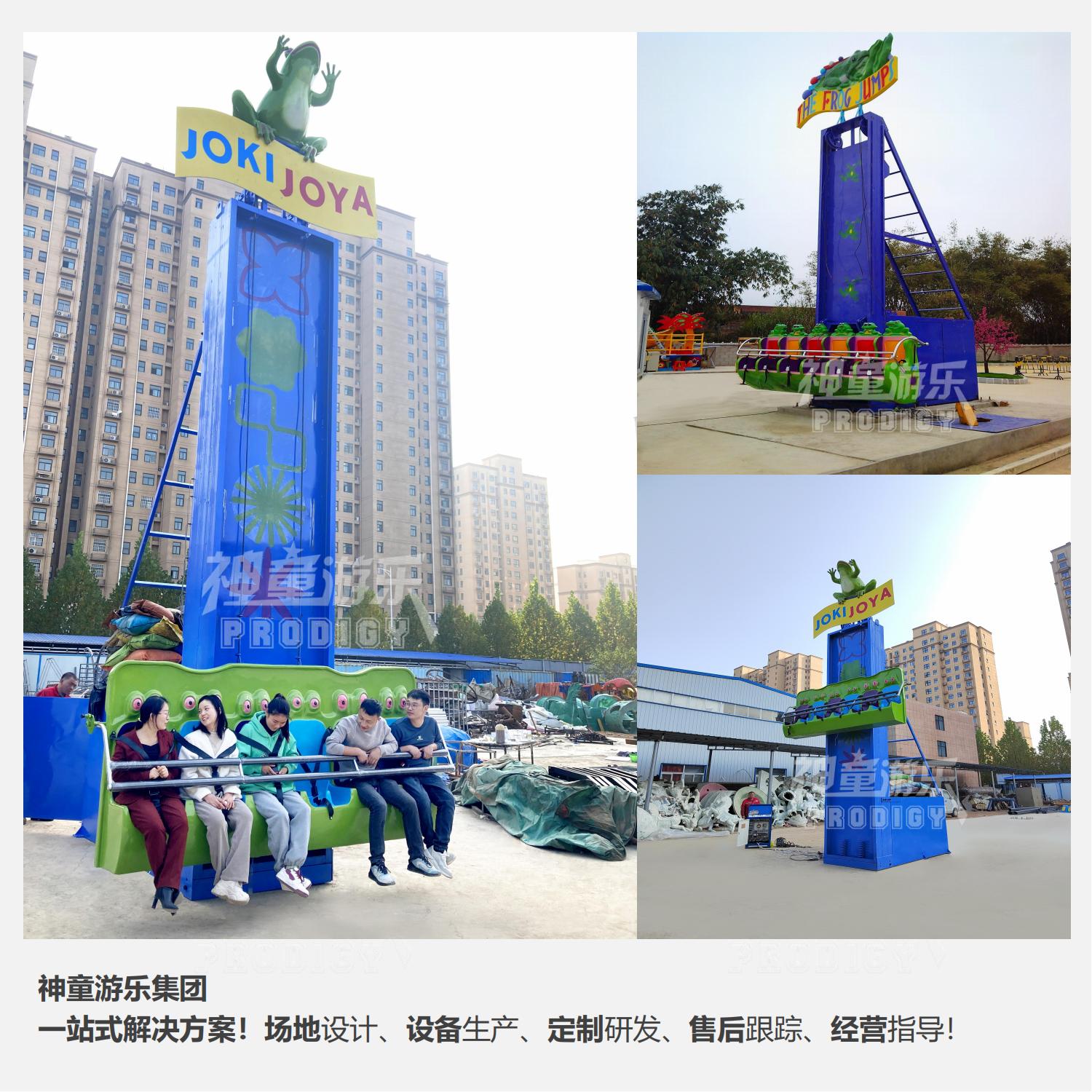青蛙跳游藝機(jī)是屬于一種勻速升高、分段下降的游樂設(shè)備,設(shè)備配有六個(gè)座位。其主要結(jié)構(gòu)為龍門架,座椅,油缸。操作人員待游客坐好后,扣好安全帶、桿,游客升高到一定高度,然后會跳躍式分段下降,猶如坐在大青蛙的背上蹦蹦跳跳的感覺。深受游客的喜歡,特別是青少年游客的喜愛。